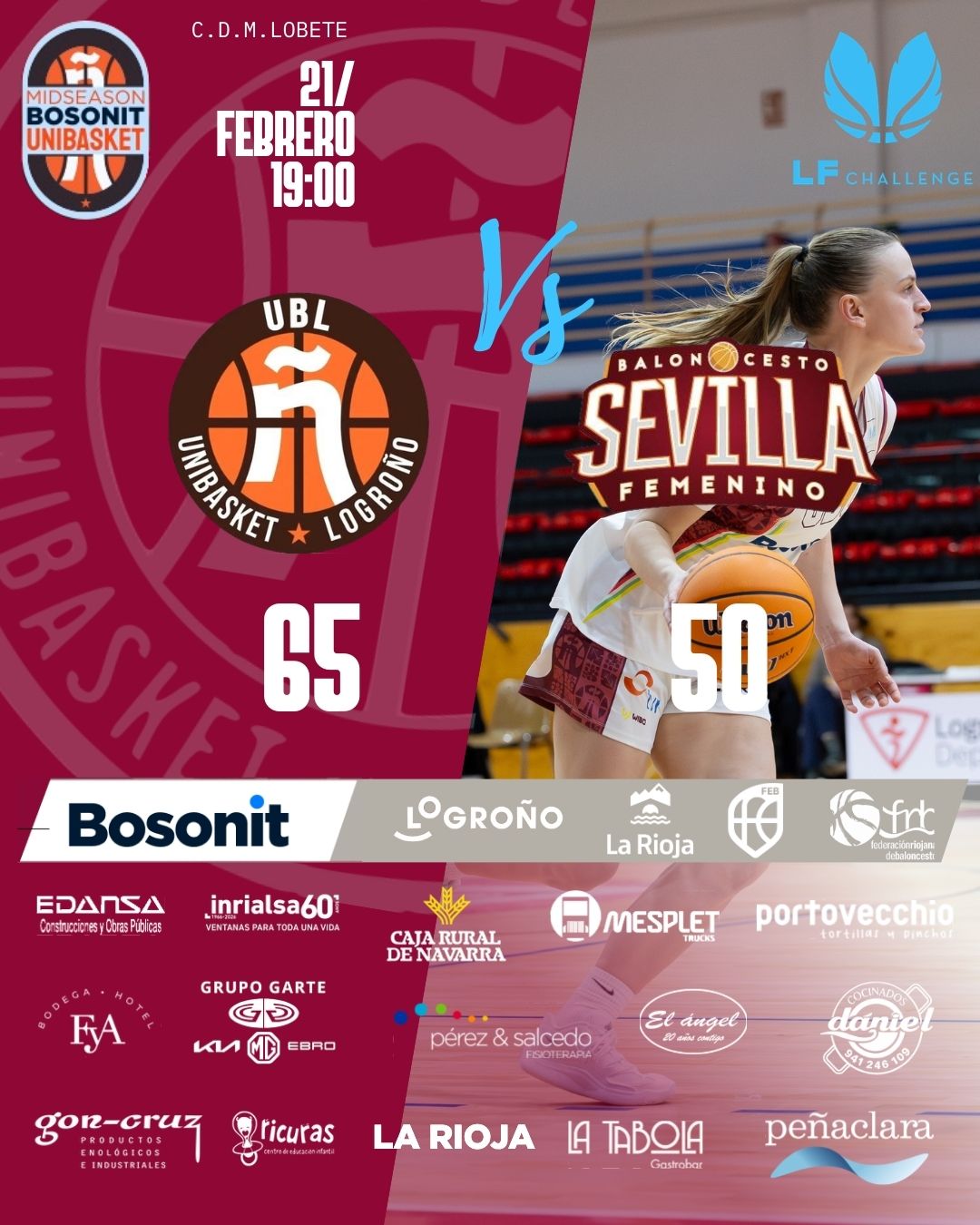 El Bosonit Unibasket sumó este sábado su décima victoria del curso al imponerse por 65–50 a Cajasol Baloncesto Sevilla en Lobete, un triunfo que deja la permanencia en Liga Challenge prácticamente asegurada. Aunque el pabellón no llegó a llenarse, sí se notó una mayor presencia de afición que en otros partidos, algo que actuó como un auténtico revulsivo para las jugadoras. Además, destacó la presencia en la grada de Miguel Sainz, Teniente Alcalde del Ayuntamiento de Logroño, que se unió al ambiente que contagió al equipo en los momentos clave.