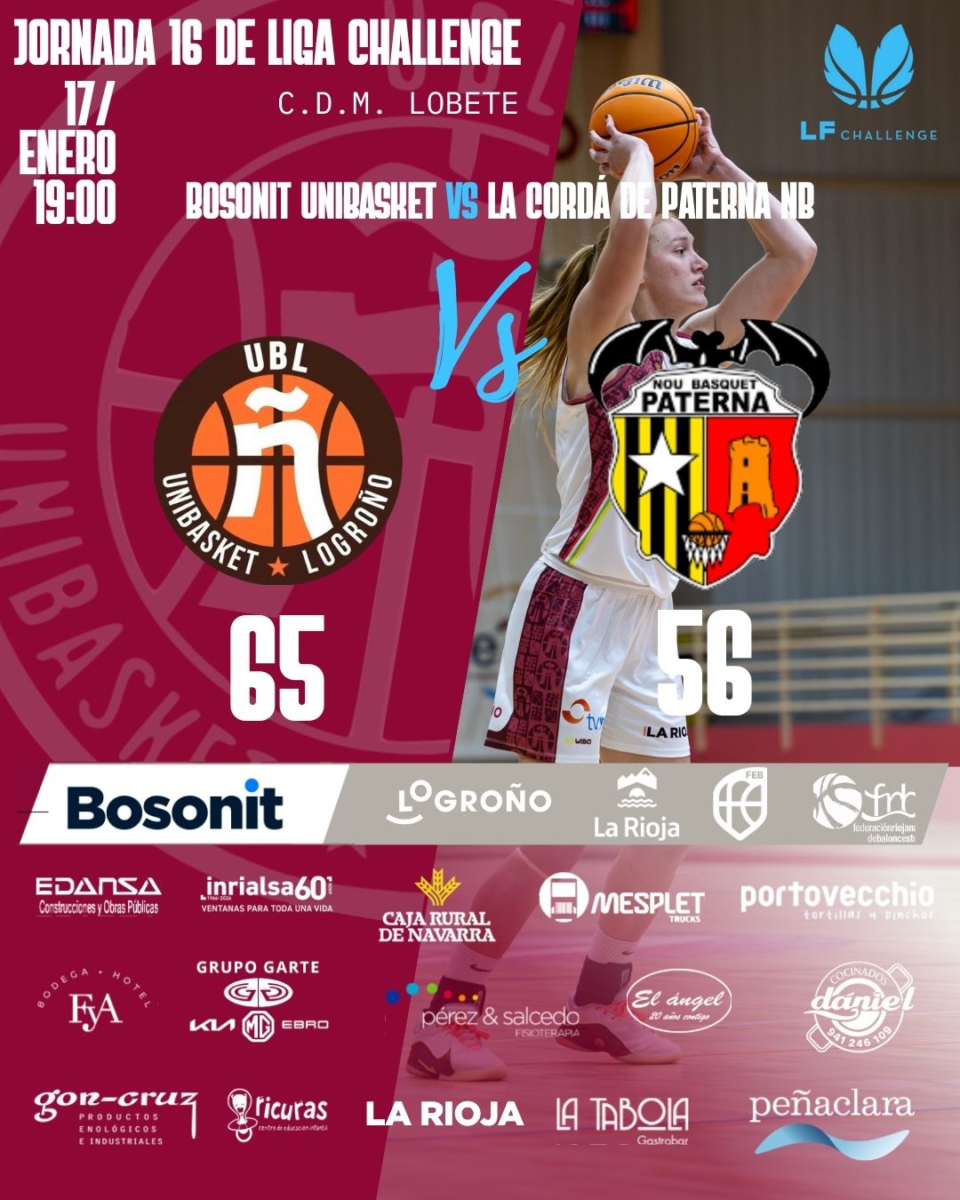El Bosonit Unibasket logró una victoria de enorme valor en Lobete al imponerse a La Cordà de Paterna por 65–56, en un encuentro marcado por la solidez defensiva y el control del ritmo desde el primer cuarto. El equipo riojano construyó su triunfo desde el trabajo colectivo, con un inicio muy serio (21–14) y una primera parte en la que supo imponer su identidad ante un rival directo. La aportación coral en rebote y la buena circulación de balón permitieron a las locales mantener la iniciativa en todo momento.